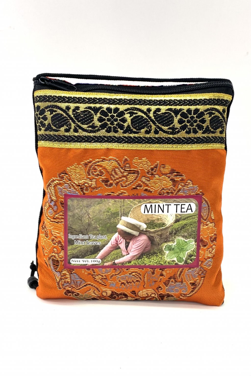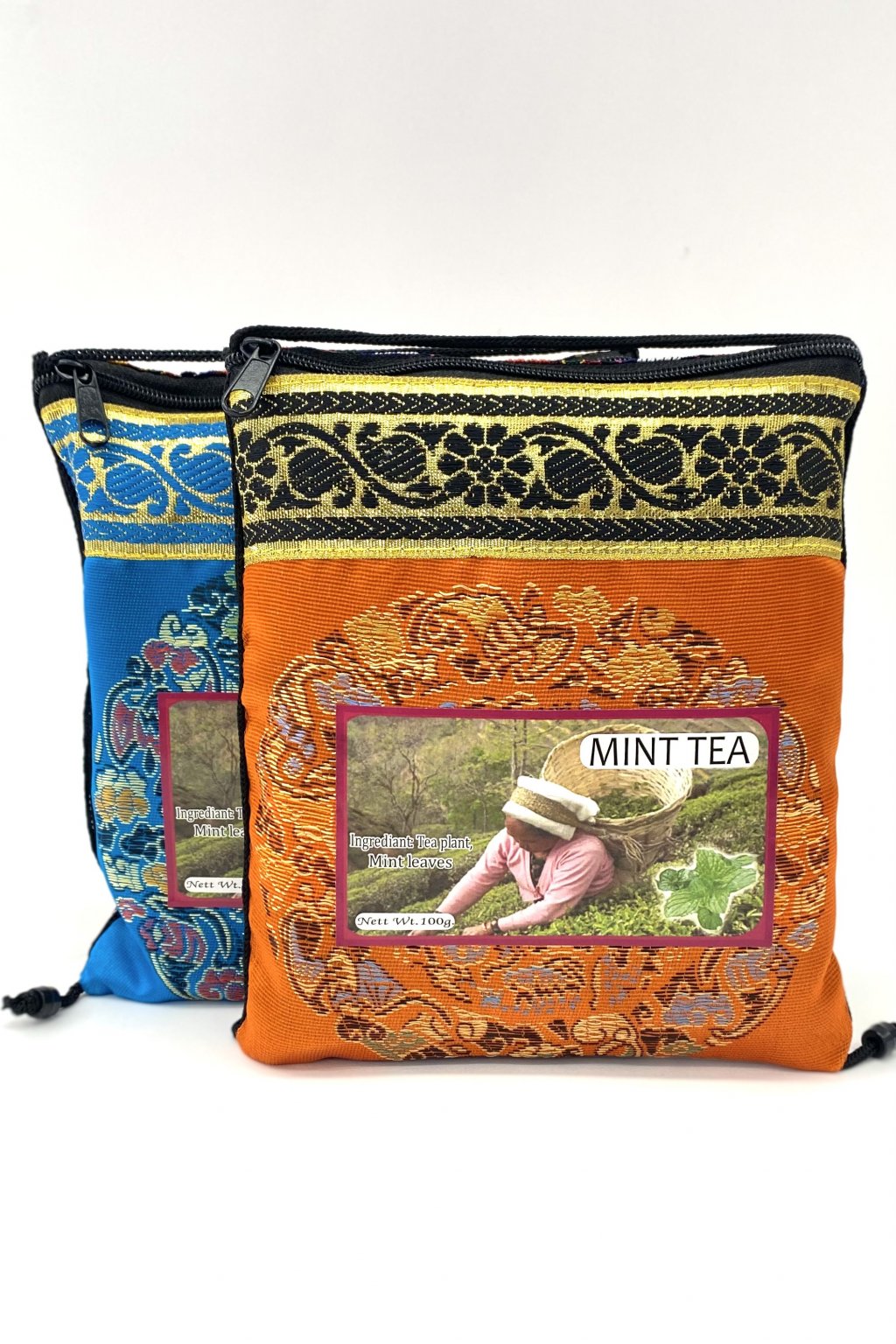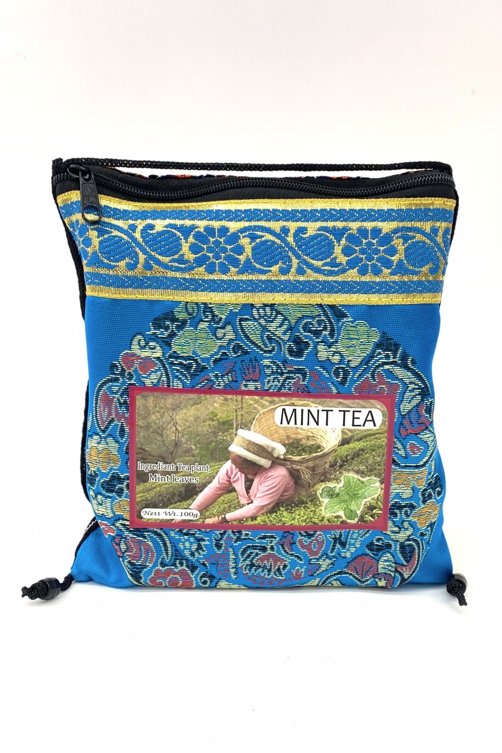 Černý sypaný čaj ochucený mátou v dárkové brokátové taštičce