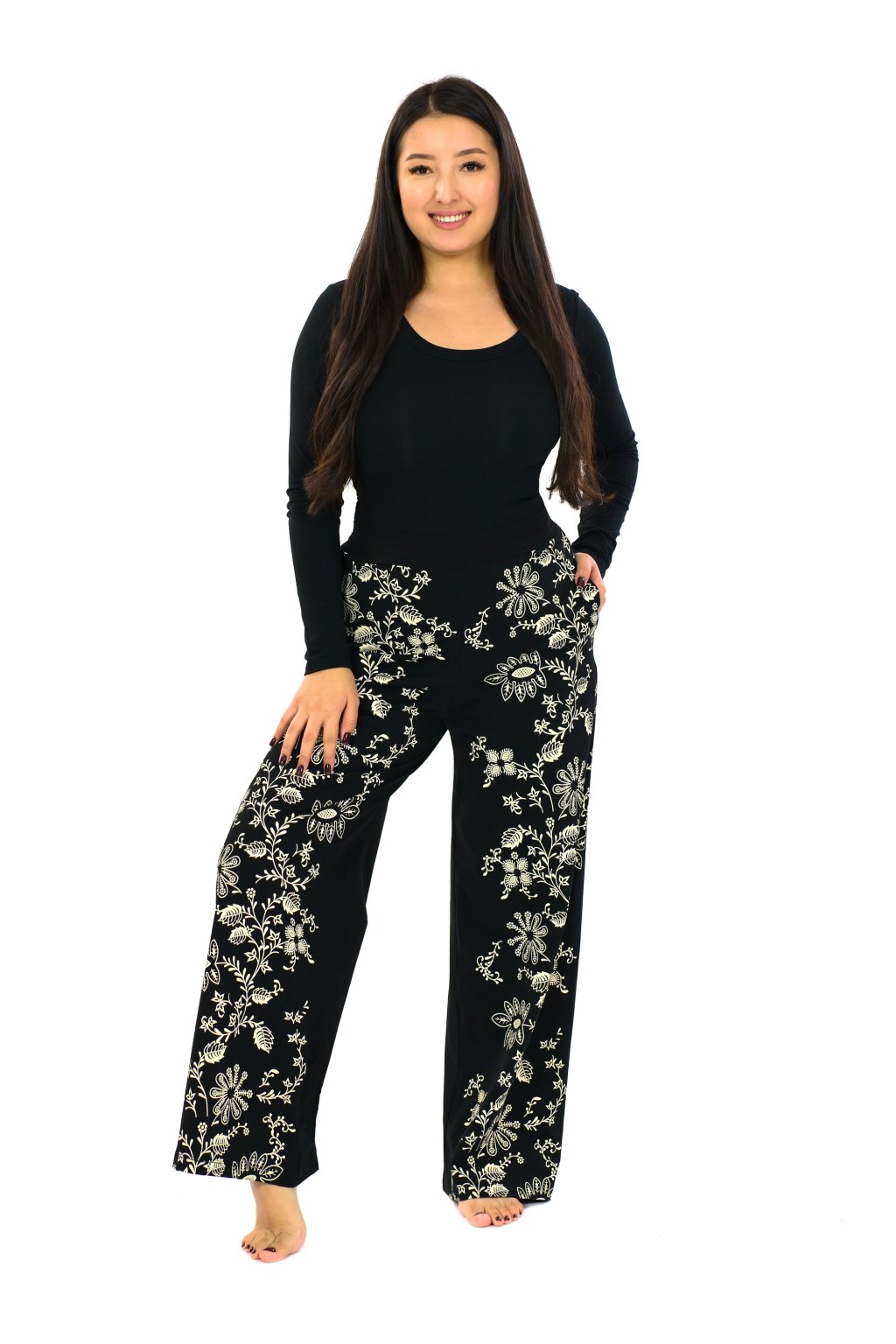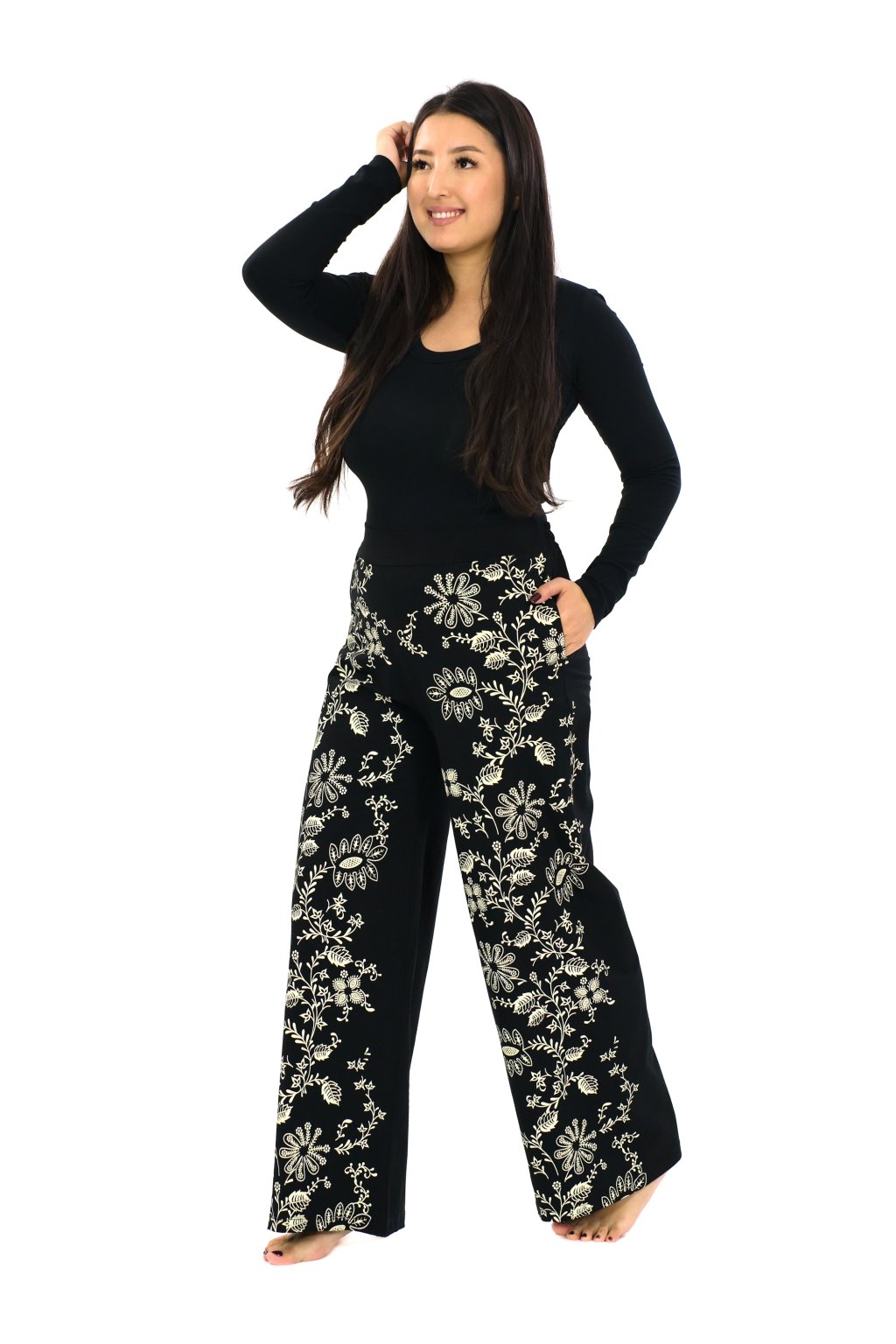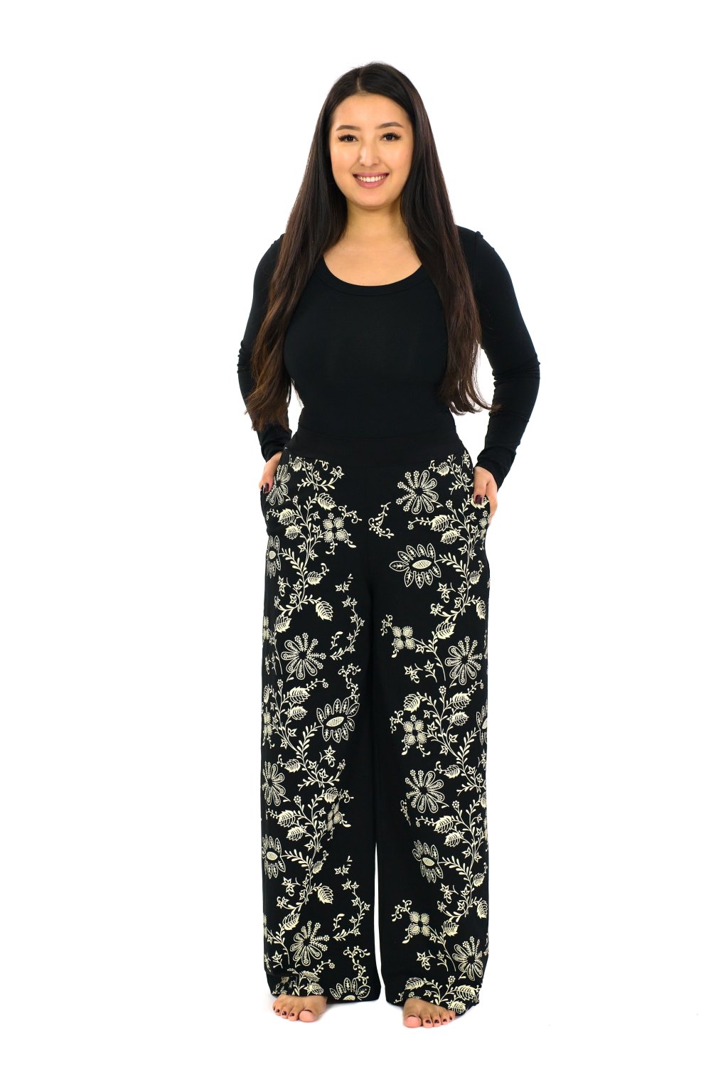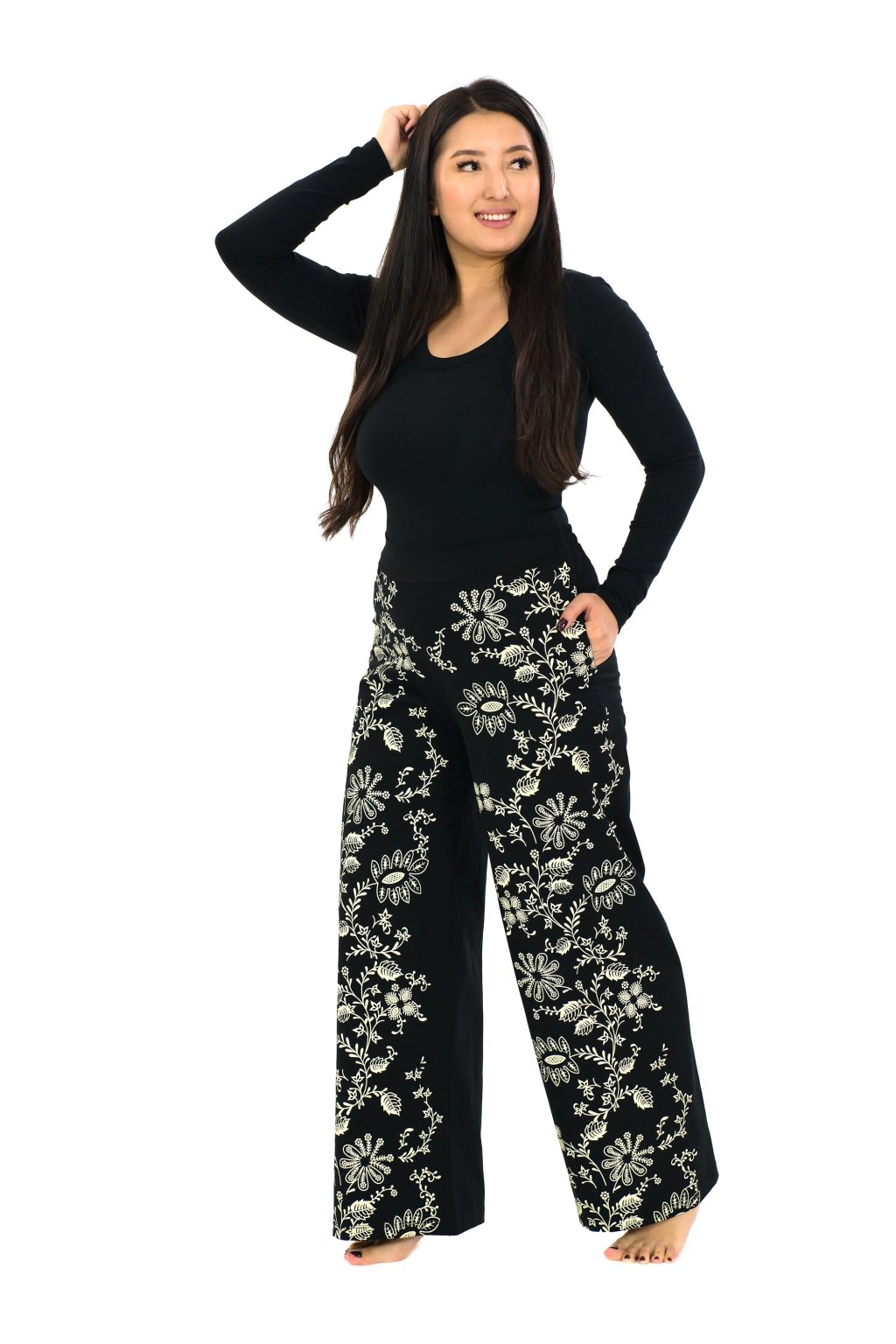 Jejich pas je v přední části z pevné látky pro elegantnější vzhled, do zadní části jsme všili gumu pro větší pohodlí. Kalhoty Daya mají na přední straně náš originální květinový potisk, vzadu jsou bez potisku. Šijeme je ve třech velikostech.