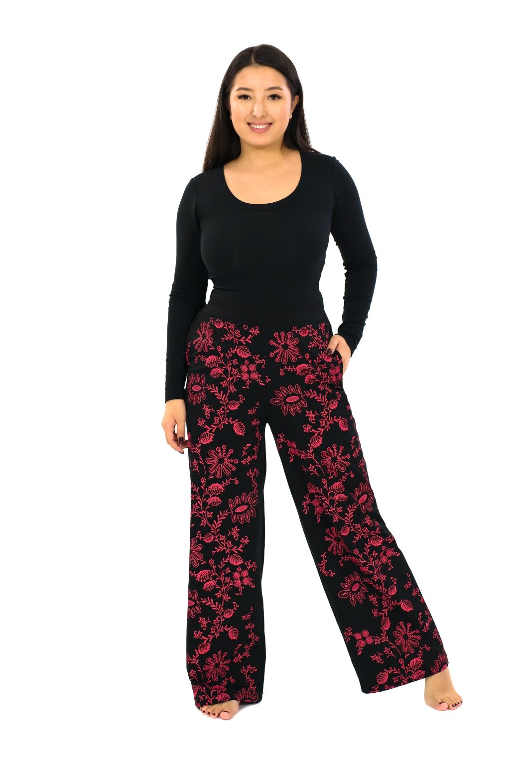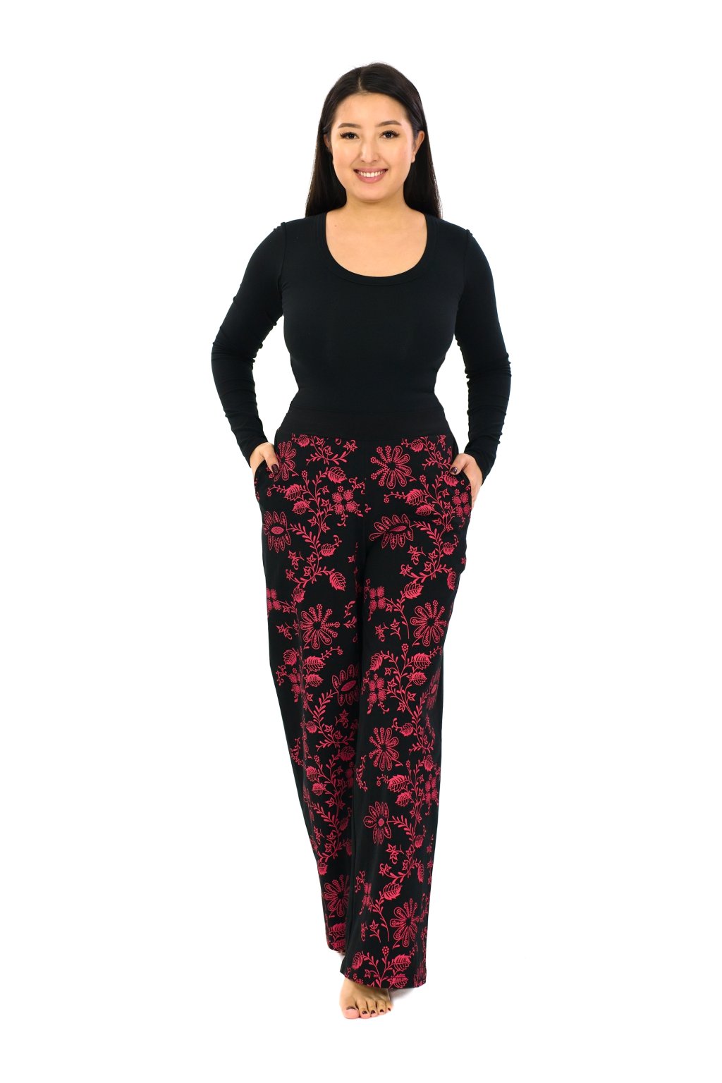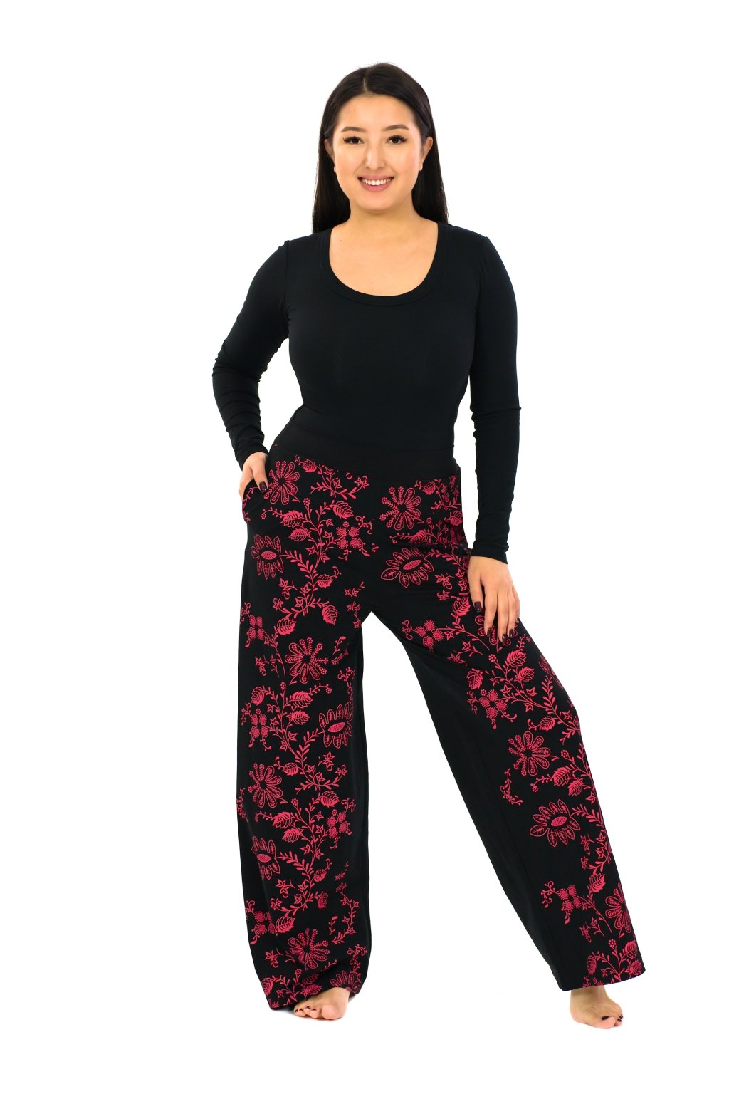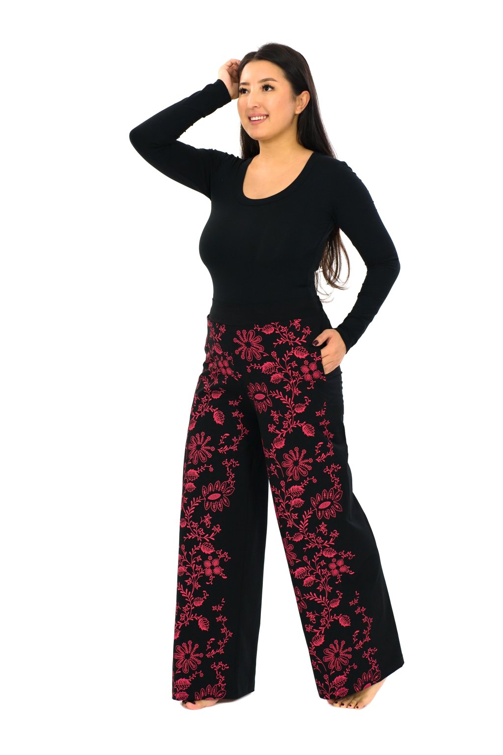 Jejich pas je v přední části z pevné látky pro elegantnější vzhled, do zadní části jsme všili gumu pro větší pohodlí. Kalhoty Daya mají na přední straně náš originální květinový potisk, vzadu jsou bez potisku. Šijeme je ve třech velikostech.