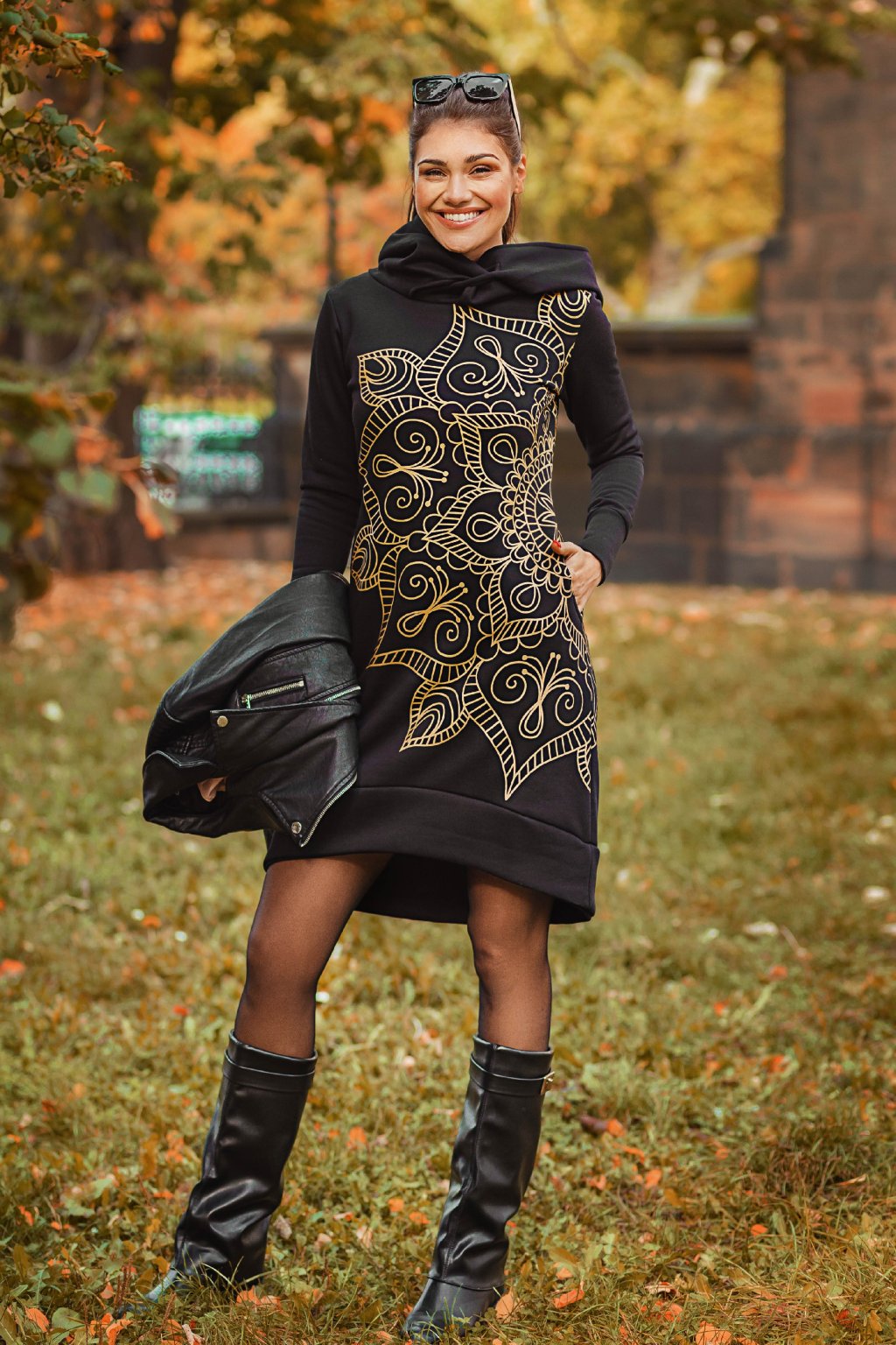 Prodloužená dámská šatomikina Ayra se pyšní kromě rafinovaného střihu, který zalichotí každé postavě, také překrásným zlatým potiskem mandaly na boku. Potisk je náš vlastní unikátní design, takže jiný takový nikde nenajdete. Skutečným designovým skvostem je však velká kapuce, kterou můžete nosit na několik osobitých způsobů.