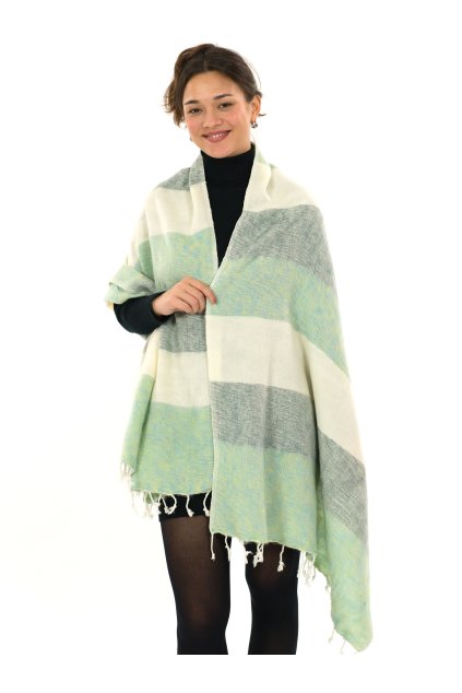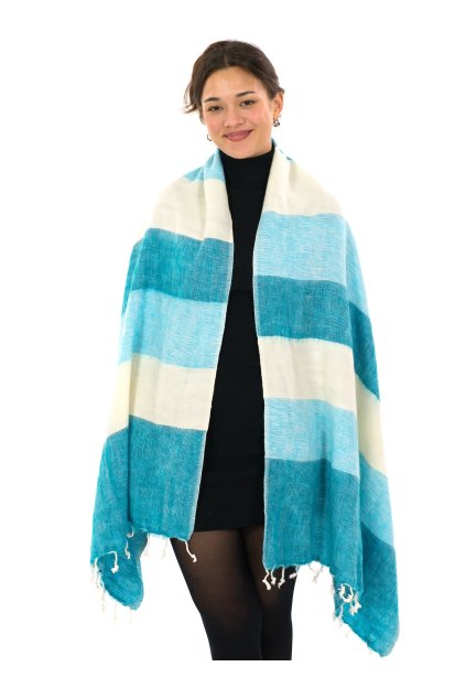 Materiál: 100% ručně tkaná hřejivá šála ze 70% vlny a 30% bavlny pro její pevnost