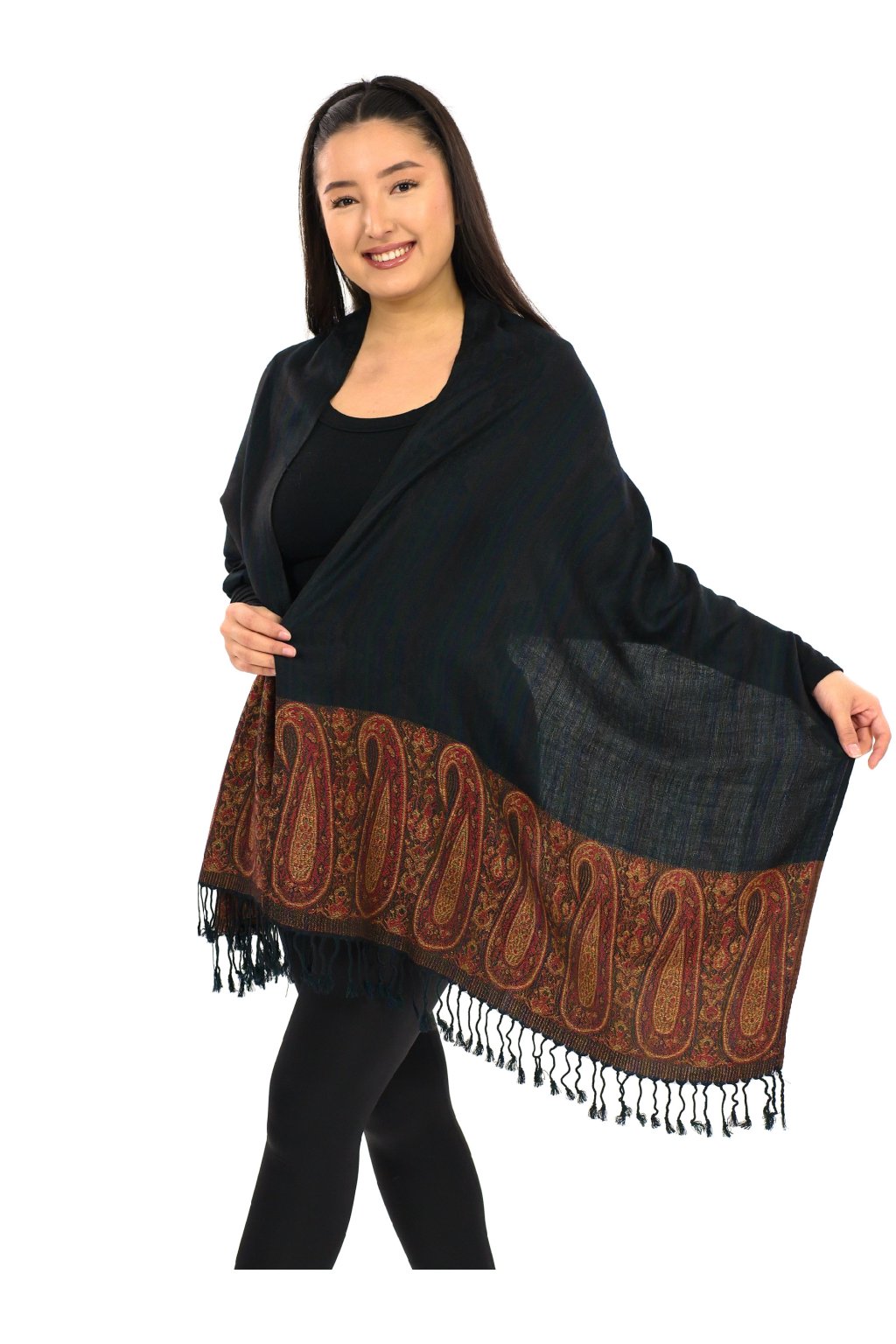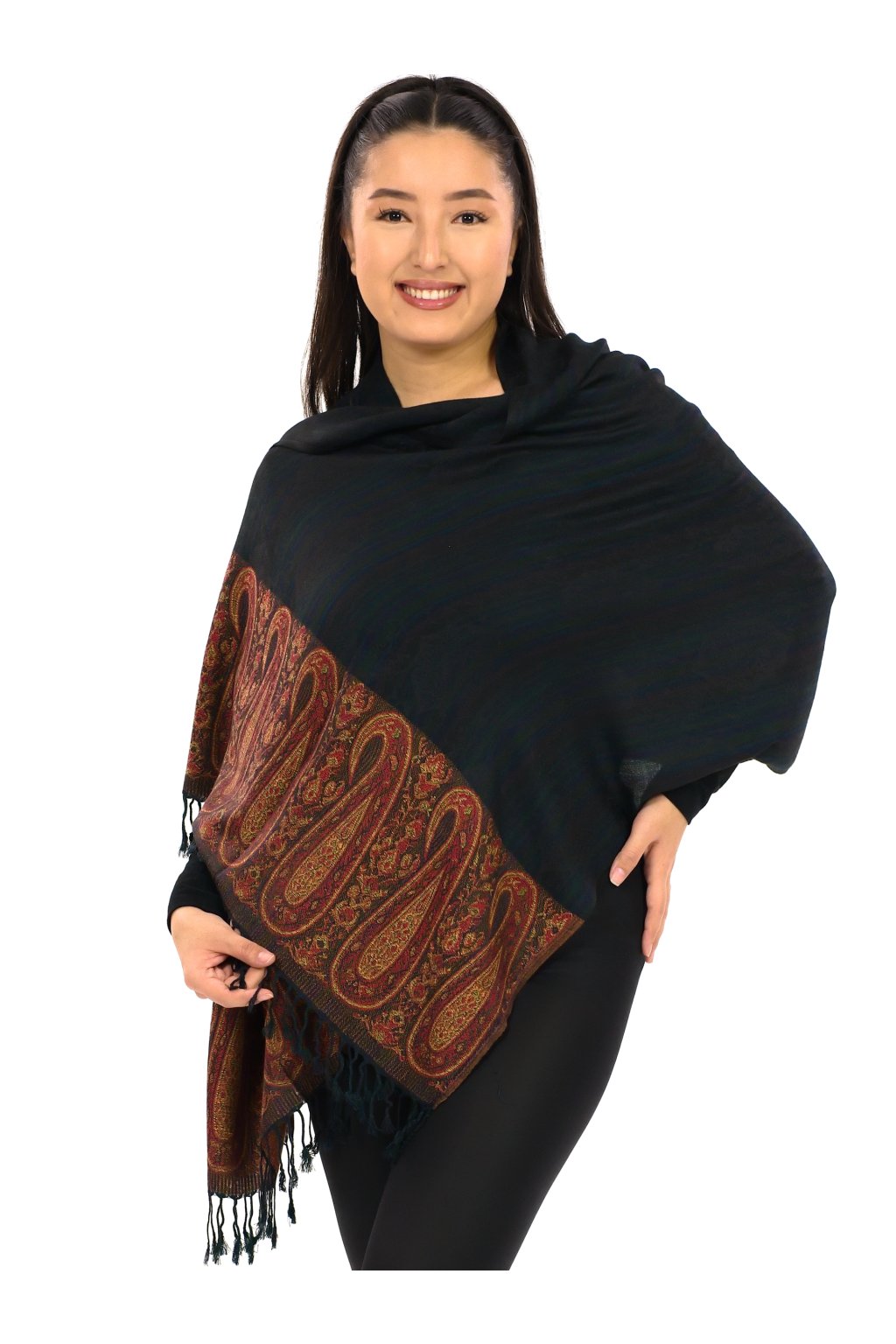 Nádherný šál lehký a jemný jako pírko, vyráběný z materiálu známého jako cashmere. Je zdobený květinami či ornamenty a z každé strany vytváří při určitém světle jiný barevný odstín.