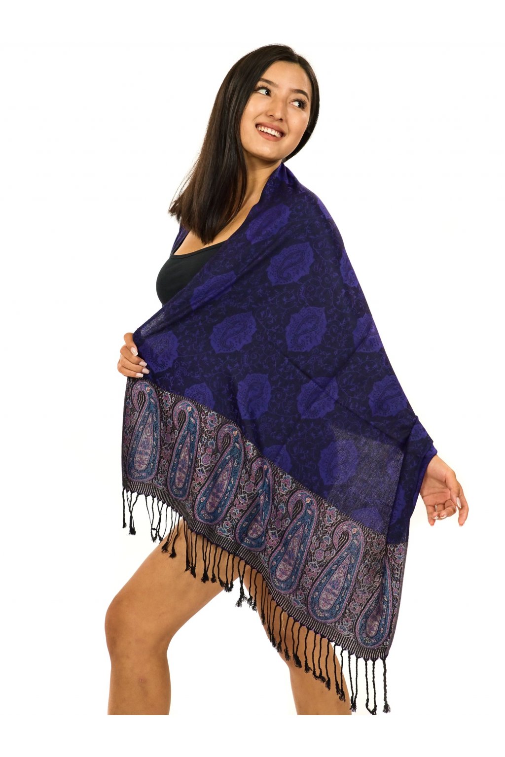 Nádherný šál lehký a jemný jako pírko, vyráběný z materiálu známého jako cashmere. Je zdobený květinami či ornamenty a z každé strany vytváří při určitém světle jiný barevný odstín.