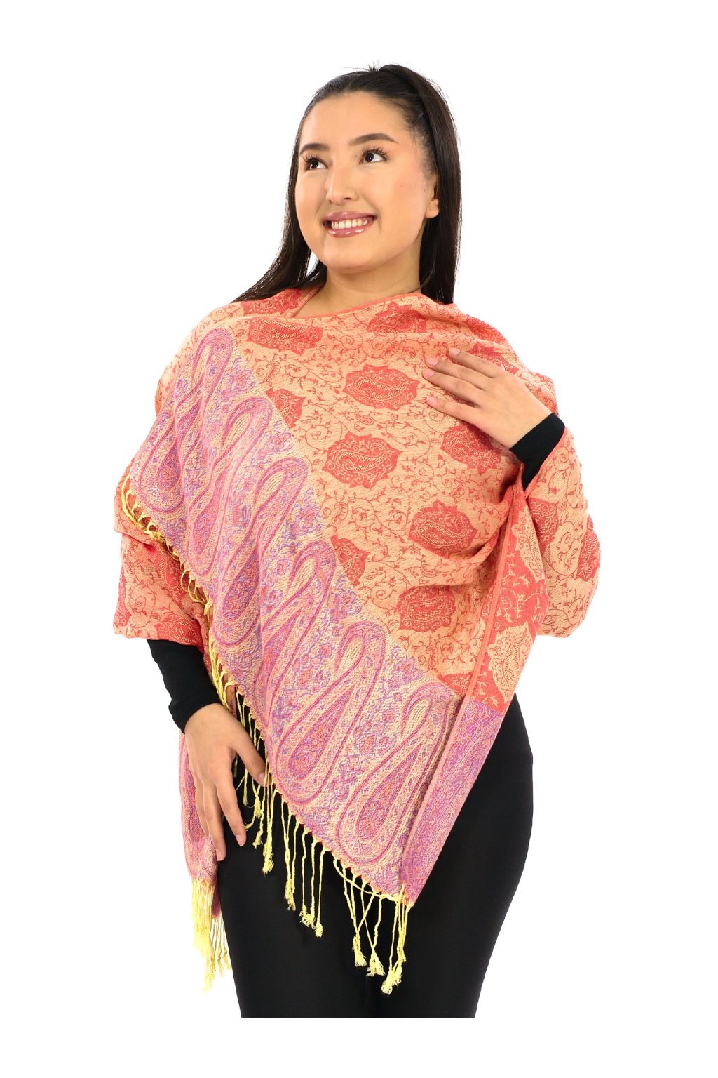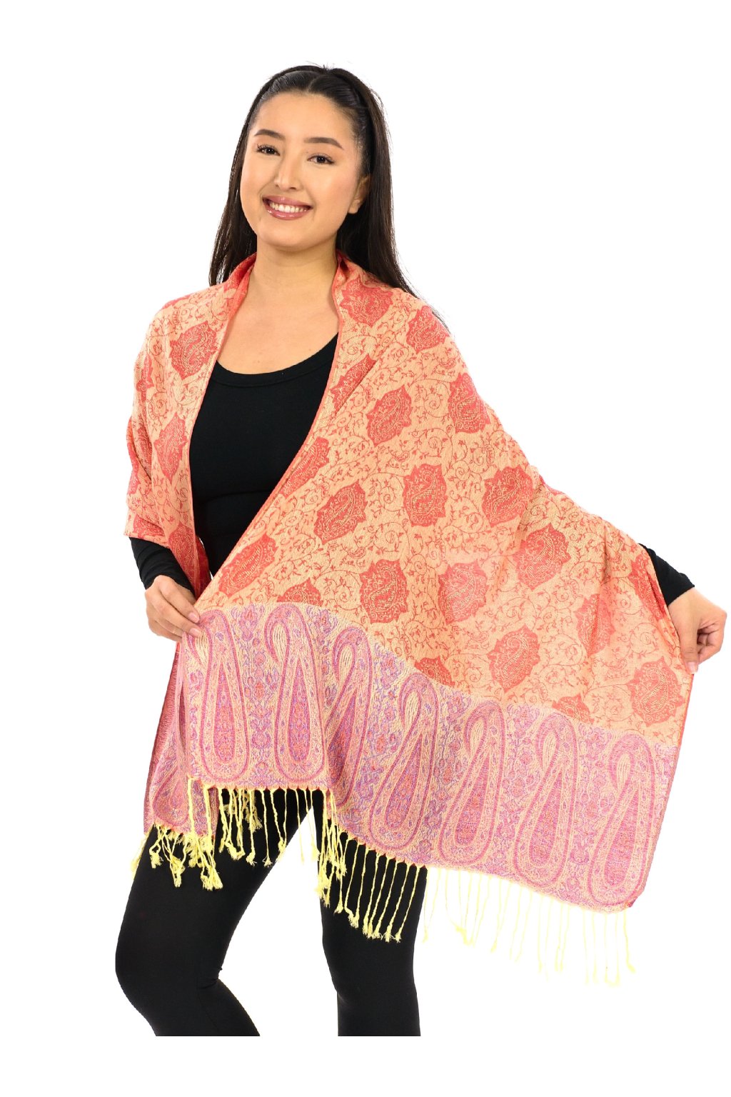 Nádherný šál lehký a jemný jako pírko, vyráběný z materiálu známého jako cashmere. Je zdobený květinami či ornamenty a z každé strany vytváří při určitém světle jiný barevný odstín.