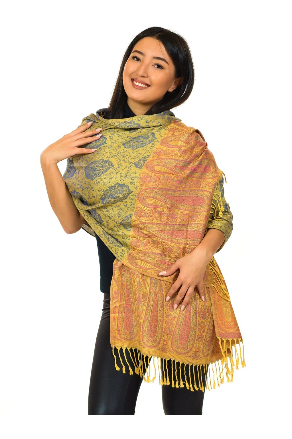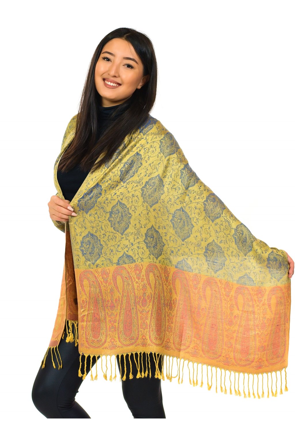 Nádherný šál lehký a jemný jako pírko, vyráběný z materiálu známého jako cashmere. Je zdobený květinami či ornamenty a z každé strany vytváří při určitém světle jiný barevný odstín.