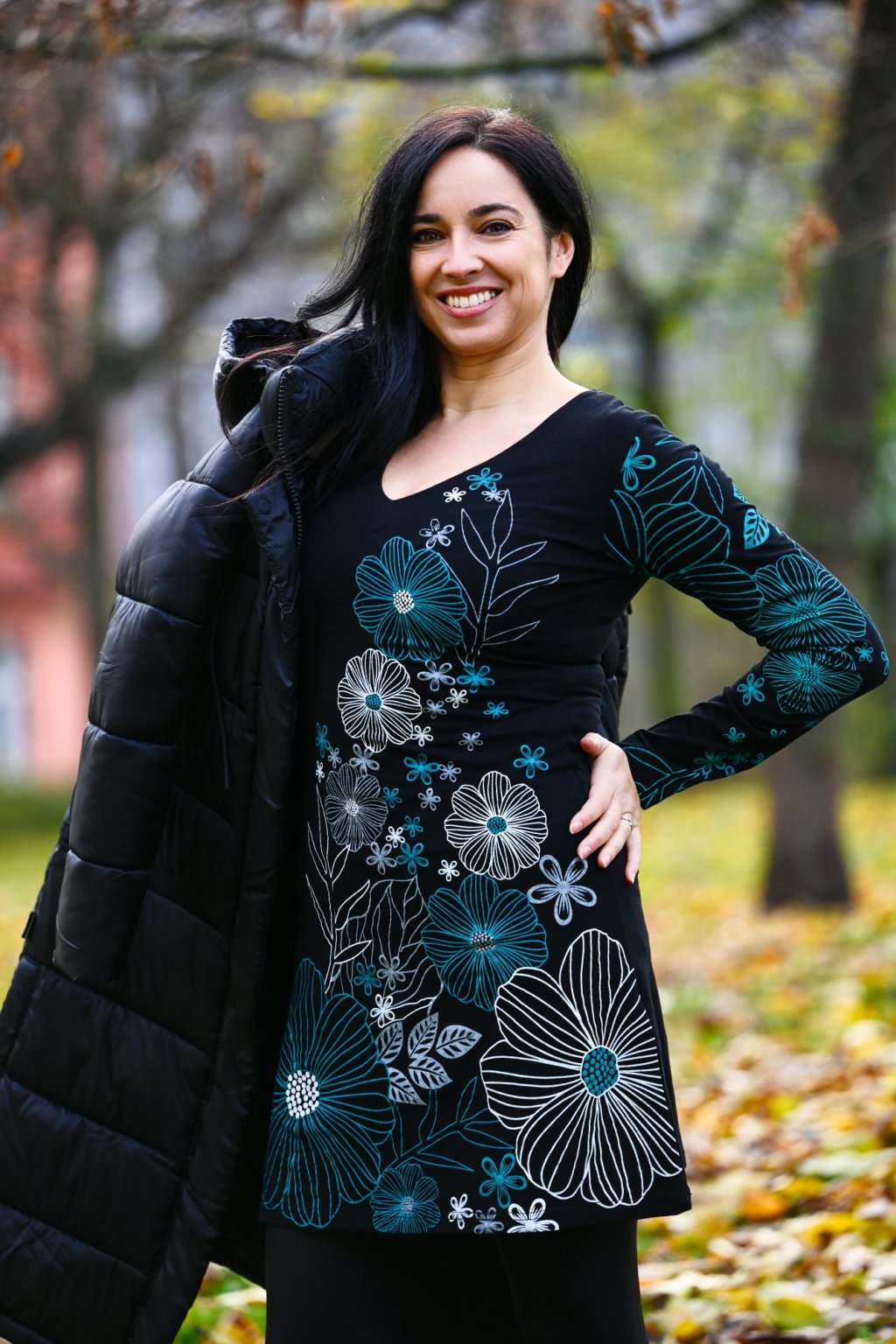Dlouhý rukáv v kombinaci s véčkovým výstřihem vám vykouzlí krásnou siluetu a jemný potisk květin završuje povedený design těchto šatů. Šaty jsme pro váš ušili ze 100% bavlny ve střihu bez kapes a v 7 různých velikostech.
