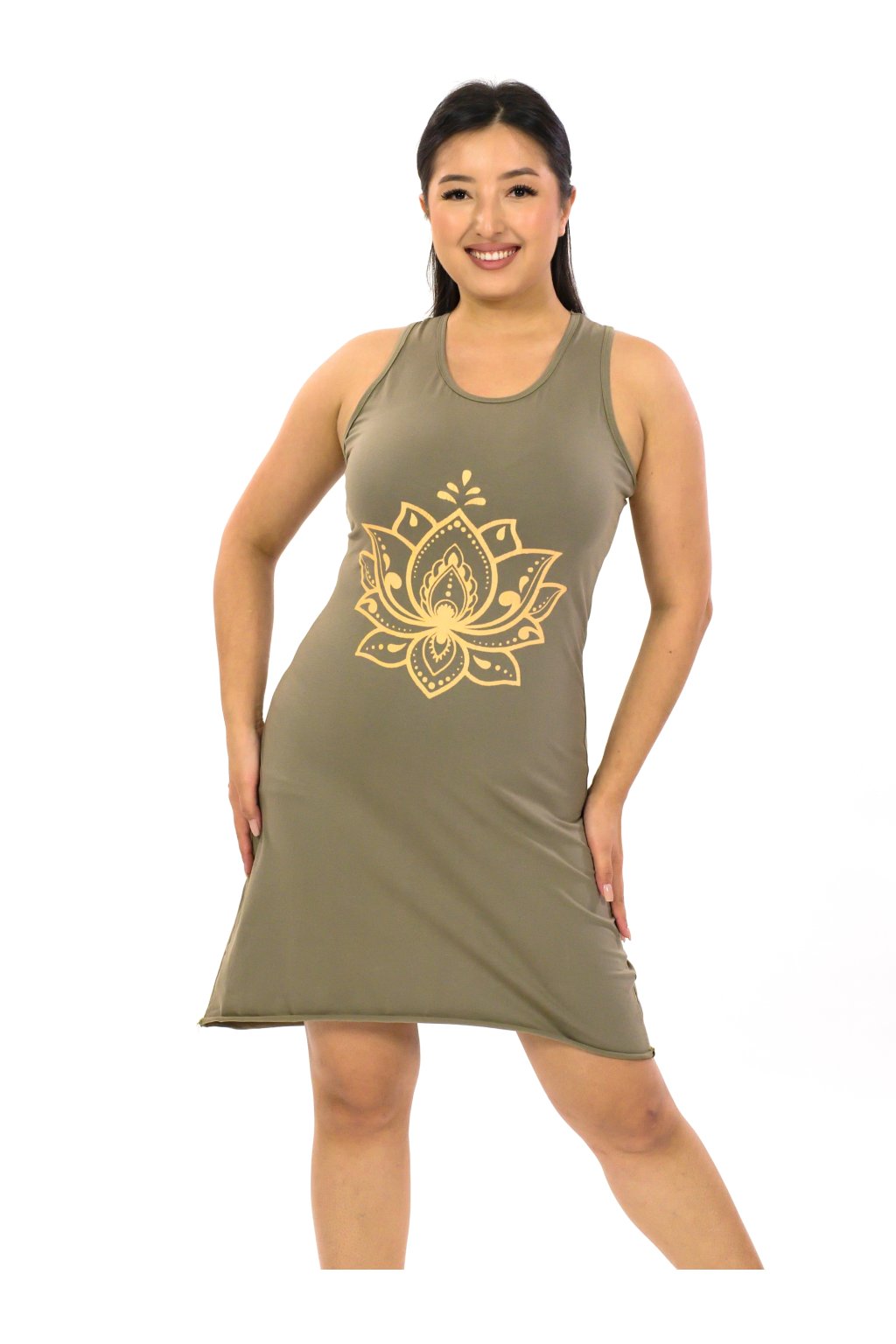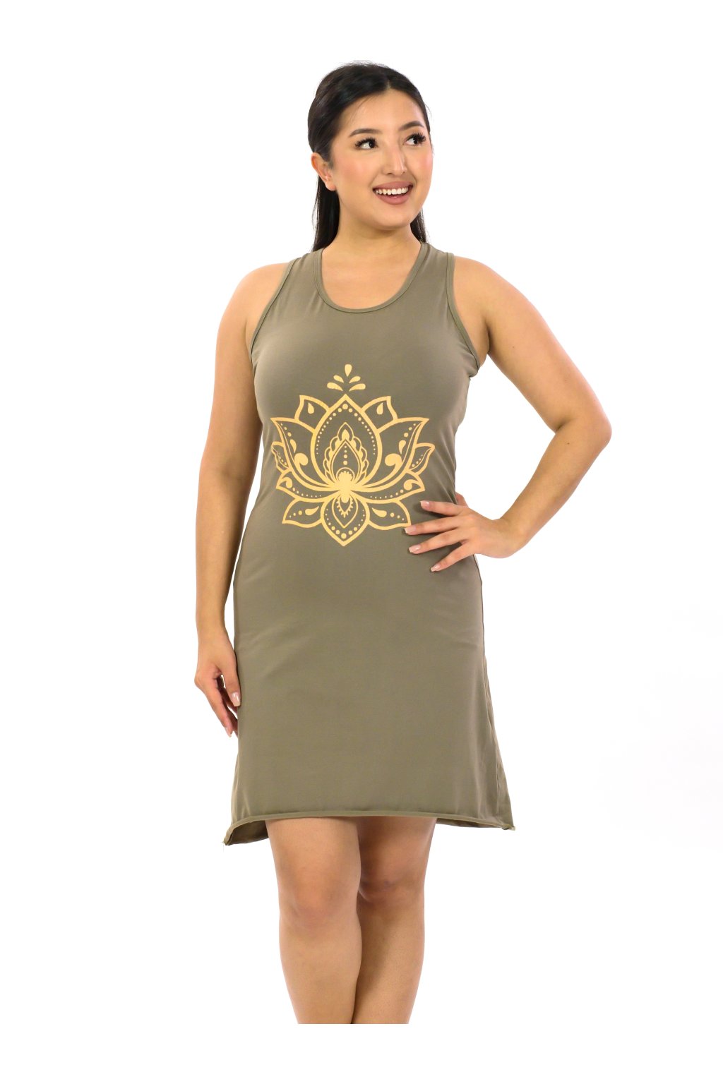 Přiléhavé šaty bez rukávu jsou ideálním doplňkem pro dny, kdy teploty stoupají ke třicítce. Basic šaty s jednoduchým potiskem lotosu se budou báječně hodit k procházkám i odpočinku.