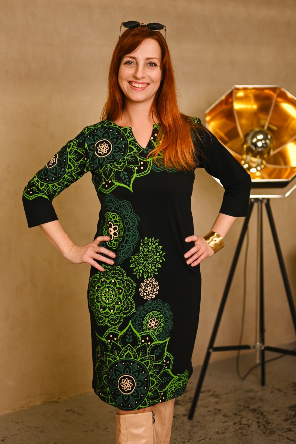 Dámské šaty Ailana jsou dokonalou kombinací mandal a ornamentů a určitě si je zamilujete. Jejich střih zalichotí každé postavě a rukávy se tříčtvrteční délkou vykouzlí štíhlé a elegantní paže. Decentně tvarovaný výstřih podtrhne vaše ženské křivky.