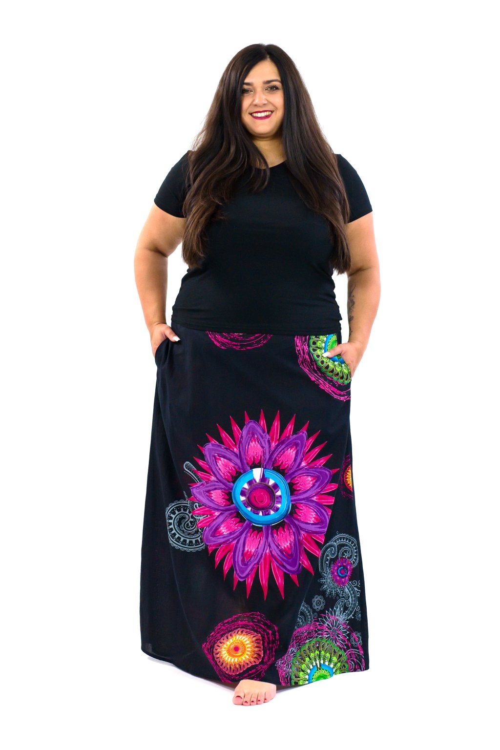 Jedinečná dlouhá dámská sukně z velice příjemné stoprocentní bavlny má nepřehlédnutelný potisk s výraznými mandalami. Díky svému širokému střihu do A sedne všem typům postavy.