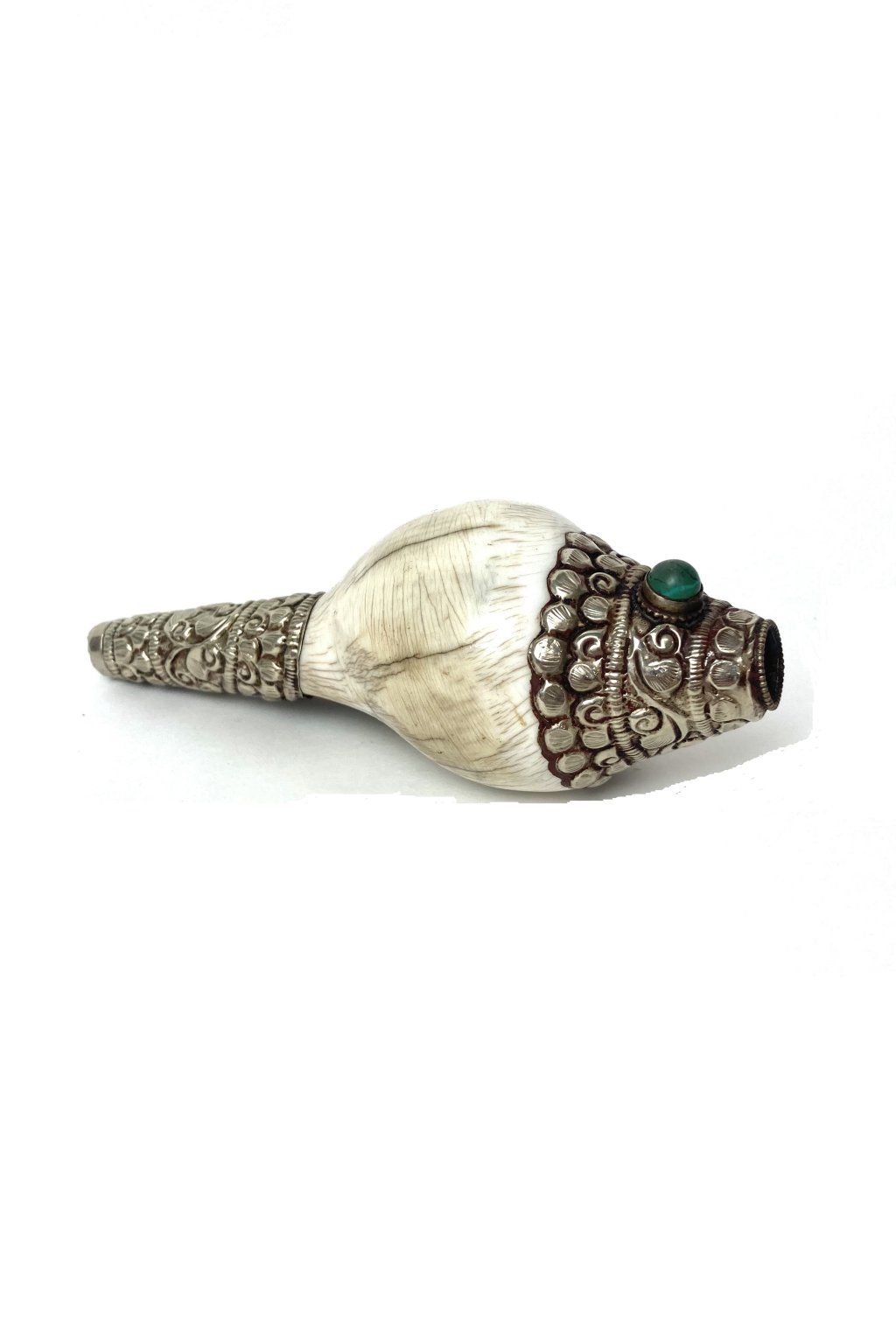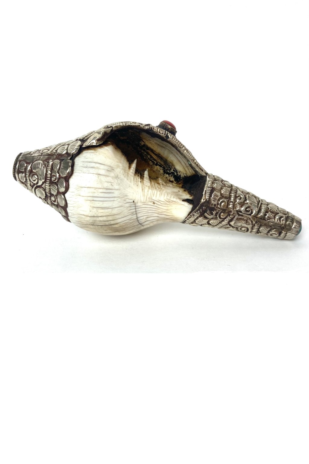 Mušle je zdobená tepaným kovem, pravděpodobně tibetským stříbrem a kameny.
