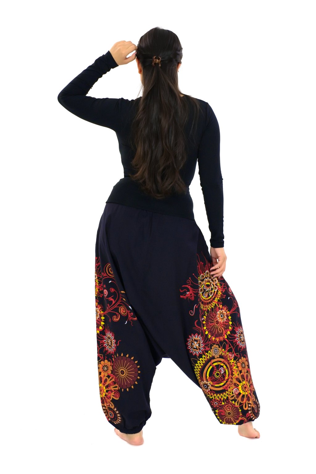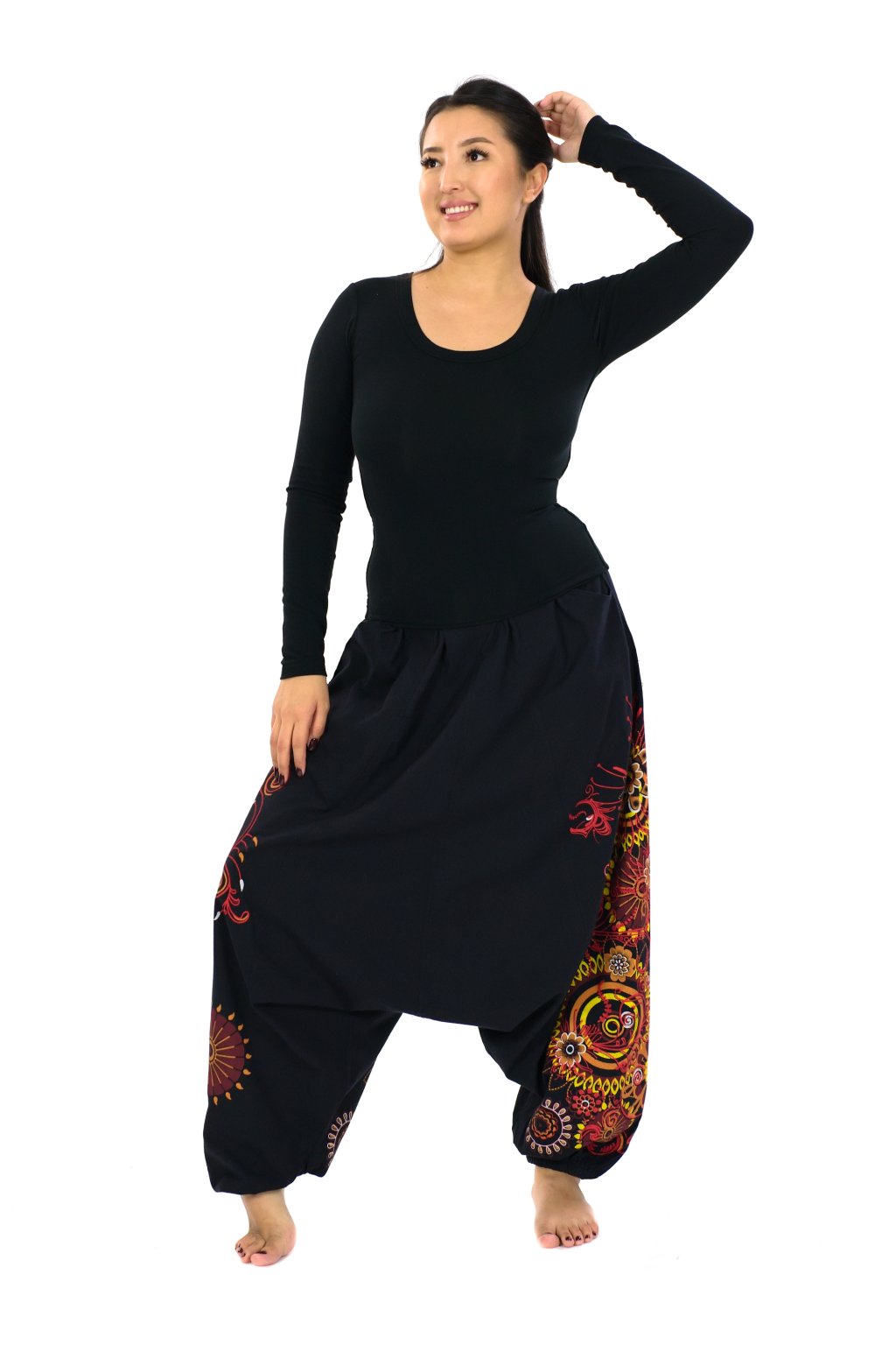 Uvidíte, že nosit tyhle pohodlné krásky je návykové! Harémové nebo taky turecké kalhoty mají volný střih, který se vám přizpůsobí díky pružné gumě v pase a stahovací šňůrce. Zdobí je mimořádně krásný vzor s mandalami a ornamenty.